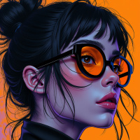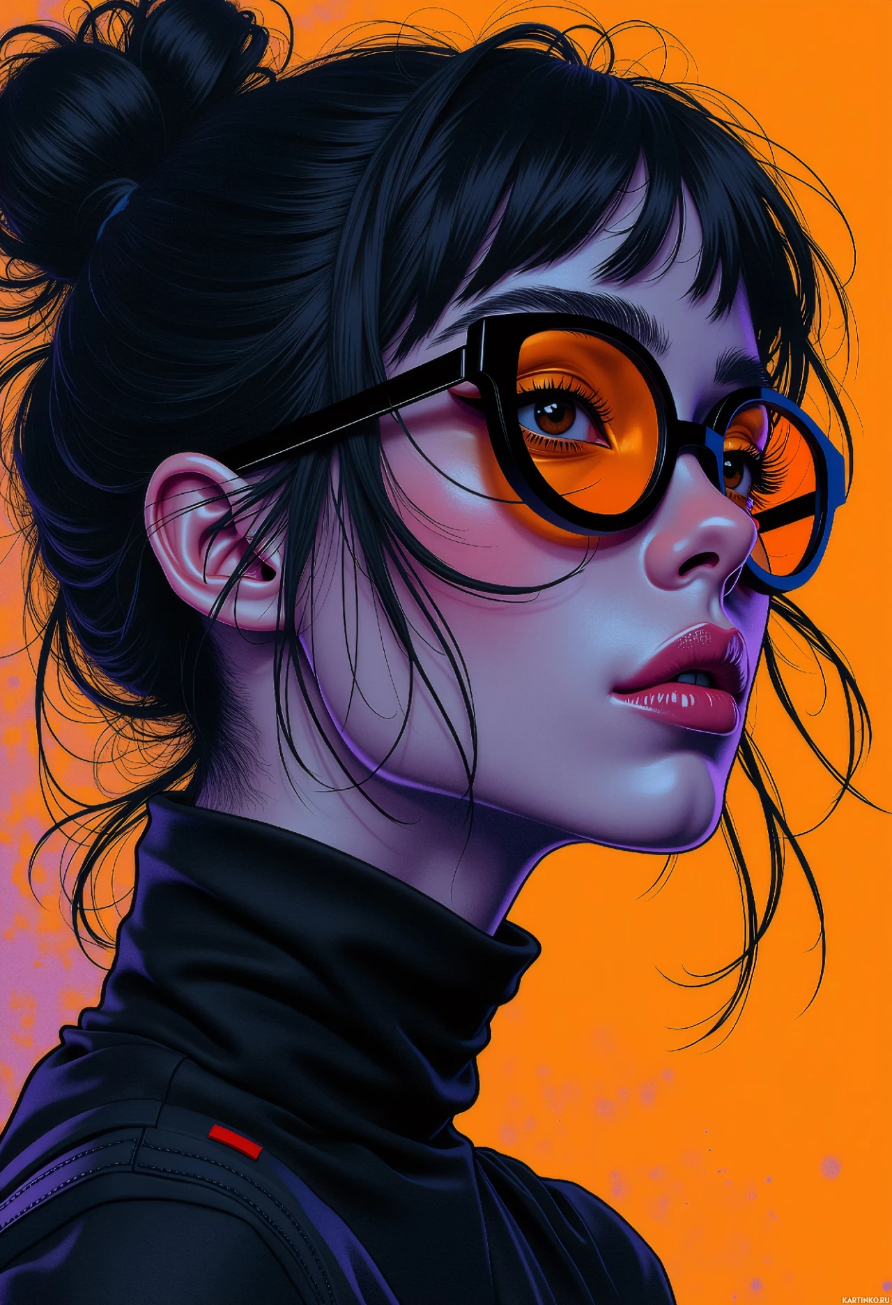brunette hair tied back with what appears to be a pink or purple accessory, and she wears large, round sunglasses with an orange or yellow tint that match the vibrant background. Her facial features are exaggerated with bold eyebrows, eyes looking directly at the viewer, and full lips in