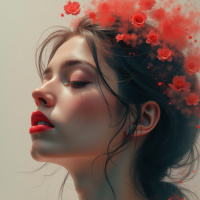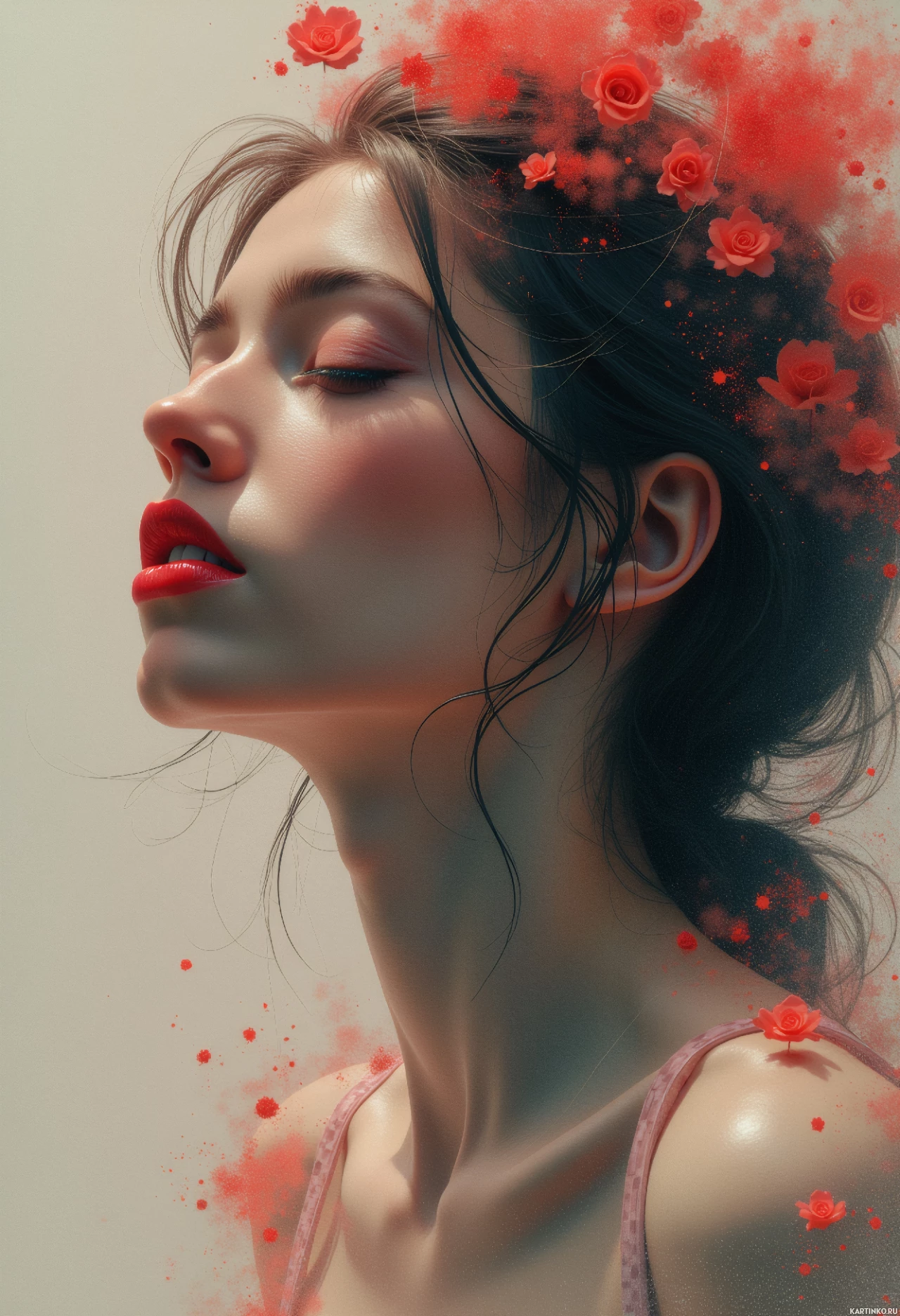 red flowers, which could symbolize love or passion, adding a vibrant contrast to the rest of the composition. The background is neutral and does not distract from the subject.