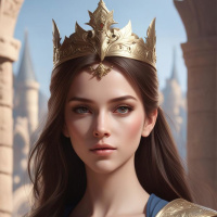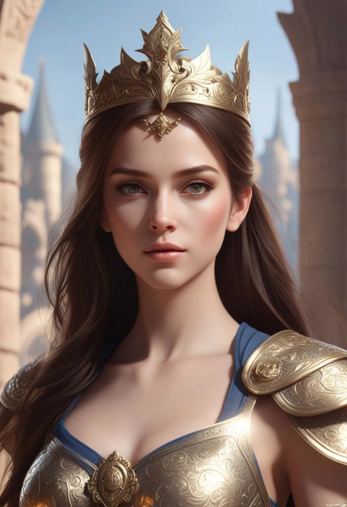 dark hair and is gazing directly at the viewer with a serious expression. Her attire includes a gold-colored breastplate that resembles armor typically worn by historical or fantasy characters. In the background, there are arches and what appears to be a castle wall, suggesting a setting of