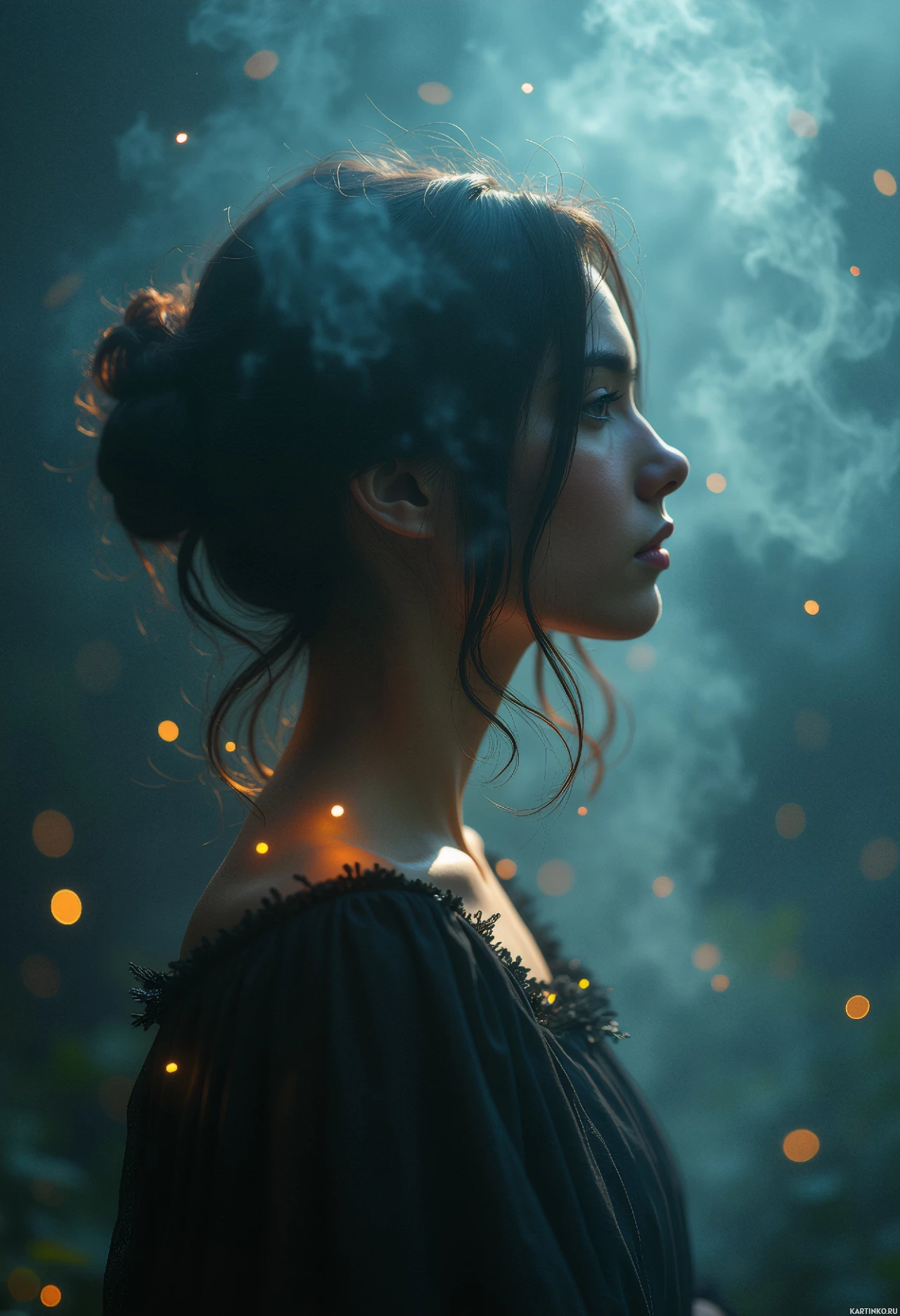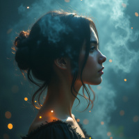 brunette hair gazing off to the side with a thoughtful expression. Her head is gently tilted, and she has her lips slightly parted as if she is deep in thought or contemplation. The woman appears to be wearing a dark-colored top with some intricate detailing around the neckline. A light haze or smoke is subtly visible behind her, adding a mystical quality to the image. The overall atmosphere of the picture conveys a sense of