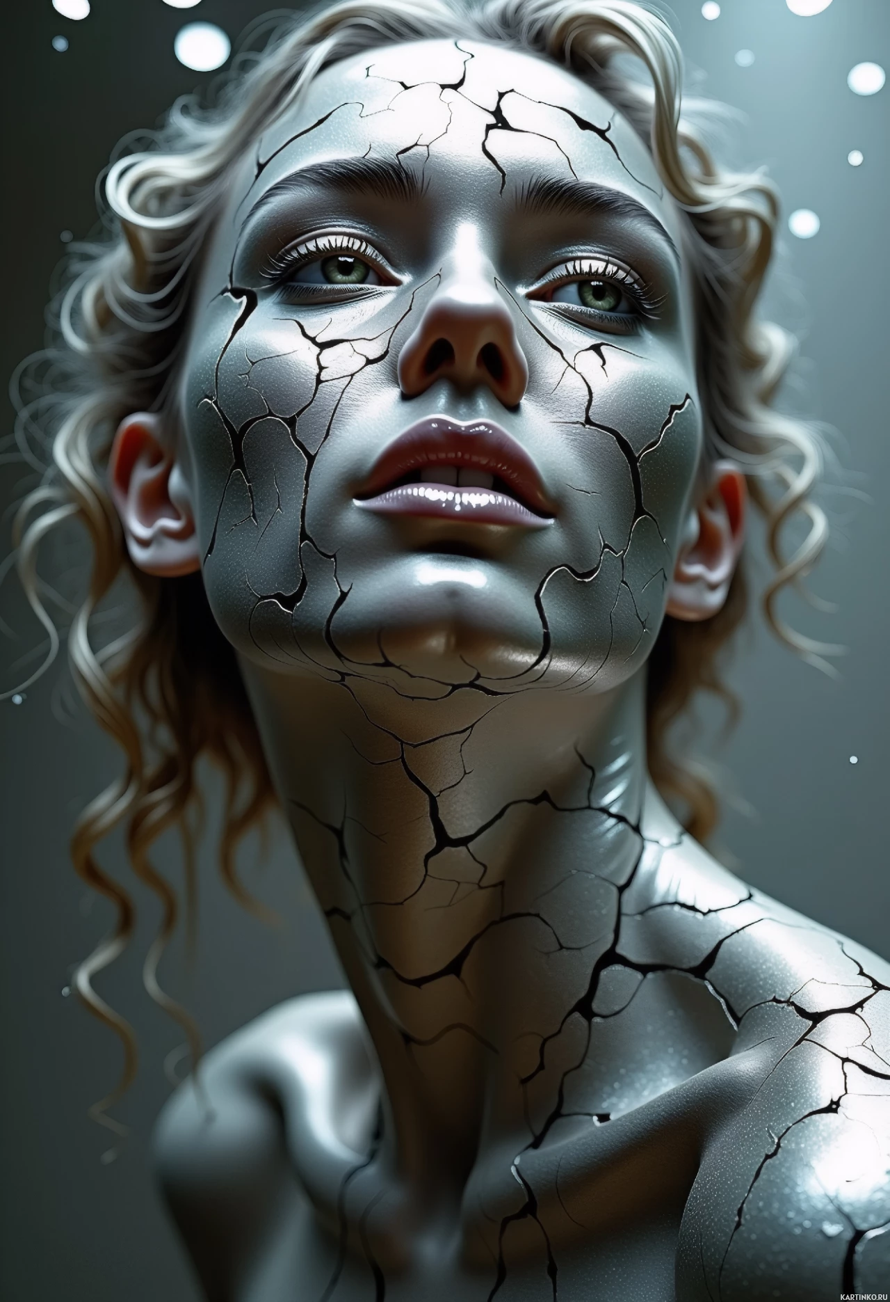 a setting in water or underwater given the bubbles or droplets visible around her face. There are visible cracks on her skin that could symbolize vulnerability, resilience, or a sense of