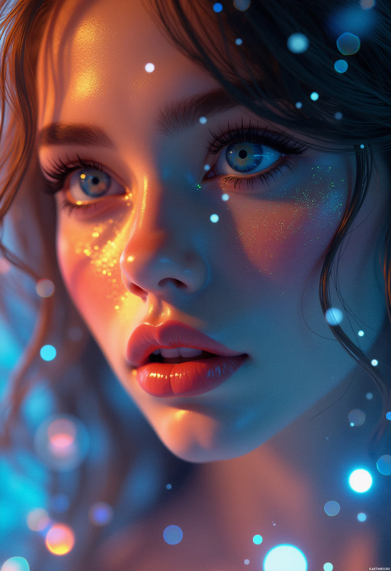 The image features a close-up of a woman with a soft and gentle expression on her face. She has medium-length brown hair, a subtle hint of freckles across her nose, and her eyes are looking off to the side with a light blueish hue to them. Her lips appear neutral and she is wearing a small amount of makeup that accentuates her eyelids and cheekbones, giving her a soft glow. She has a glittery substance, possibly cosmetic or stage makeup, on her cheeks and forehead which is reflecting the light in this setting. Her skin has a natural look to it, with some very subtle texture visible on her face. The woman appears to be young, as suggested by the smoothness of her skin and the delicate features that are often associated with younger individuals. In the background, there is an ethereal and mystical backdrop with soft lighting that enhances her facial features without creating harsh shadows. This gives the image a dreamlike quality. The color palette includes cool blues and purples, which contrast nicely with the warm tones of the woman's skin, making her the focal point of the composition. The style of the image is photographic with a focus on the beauty and intricacy of the subject's makeup and lighting effects used to enhance her features.