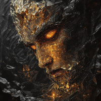 shades of gold, bronze, and black. The creature's elongated head is adorned with two large,