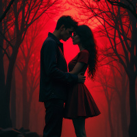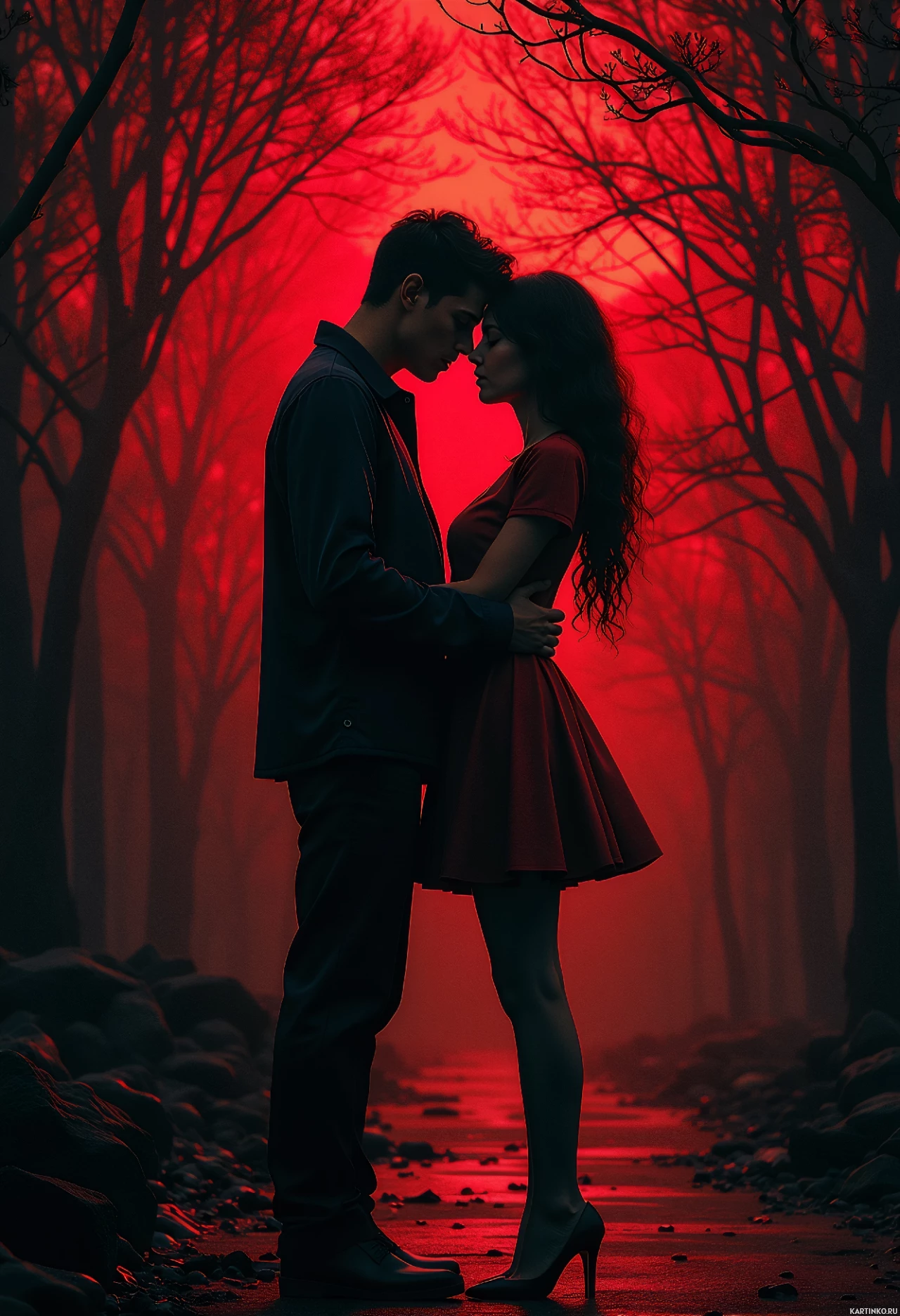 silhouettes of trees, creating a romantic and eerie atmosphere reminiscent of a forest or park at night. The man's arms are wrapped around the woman's waist, indicating