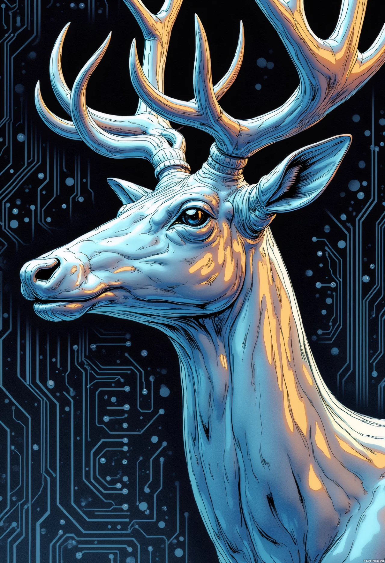 The image portrays a fantastical depiction of an animal. It features the head and upper neck of a deer, distinguished by its antlers and a soft