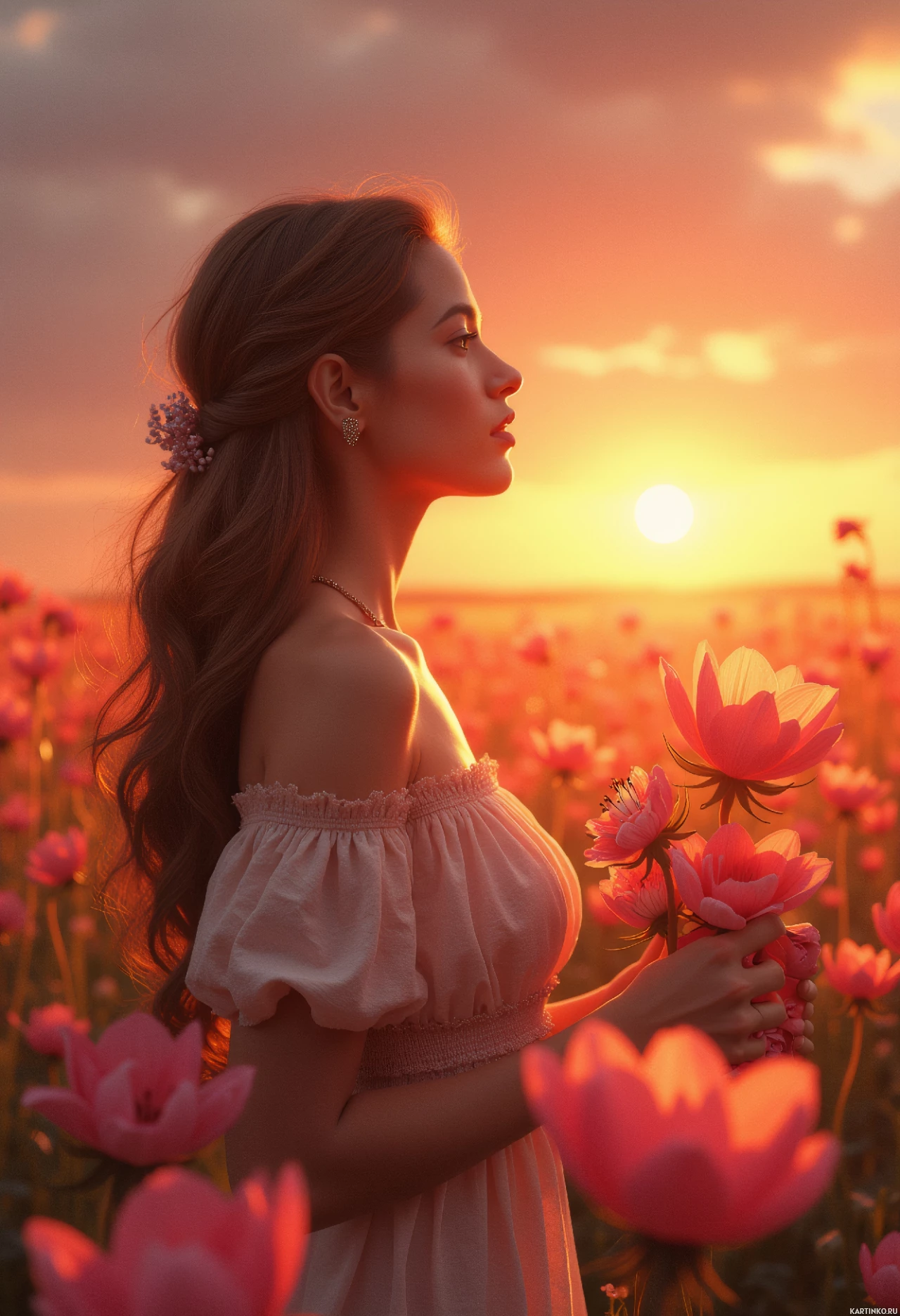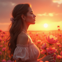 deep contemplation or admiration, as her gaze is directed away from the camera towards the horizon where the sun is setting. Her hair is styled down and she's wearing a light-colored dress with some lace detailing at the neckline. The sky transitions from a warm