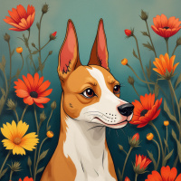 a floral backdrop. The dog's ears are perked up, indicating curiosity or attentiveness, and its eyes are looking directly at the viewer, conveying
