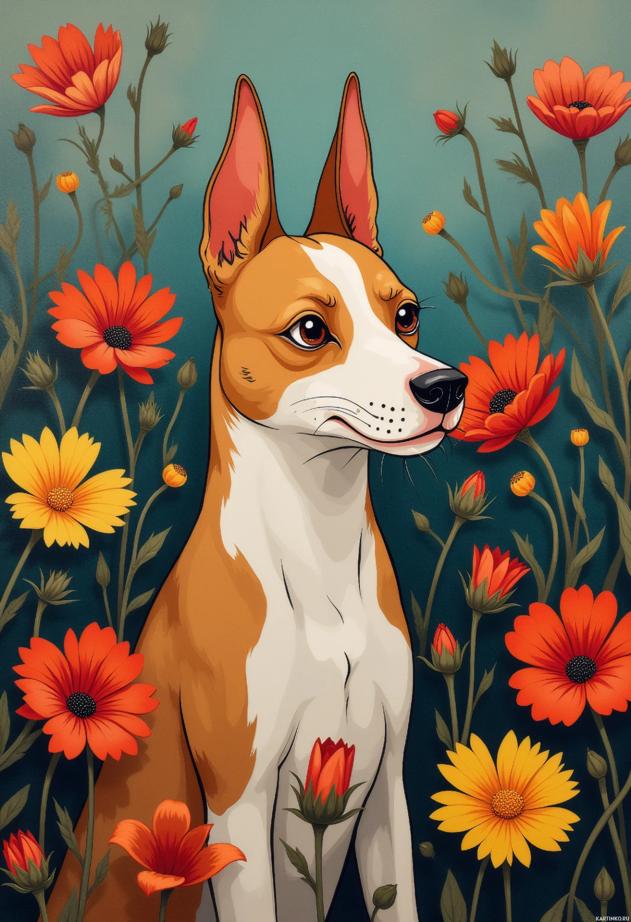 The image features an illustration of a brown and white dog, which is the central subject of the picture. Surrounding the dog are numerous vibrant orange flowers with yellow centers, creating