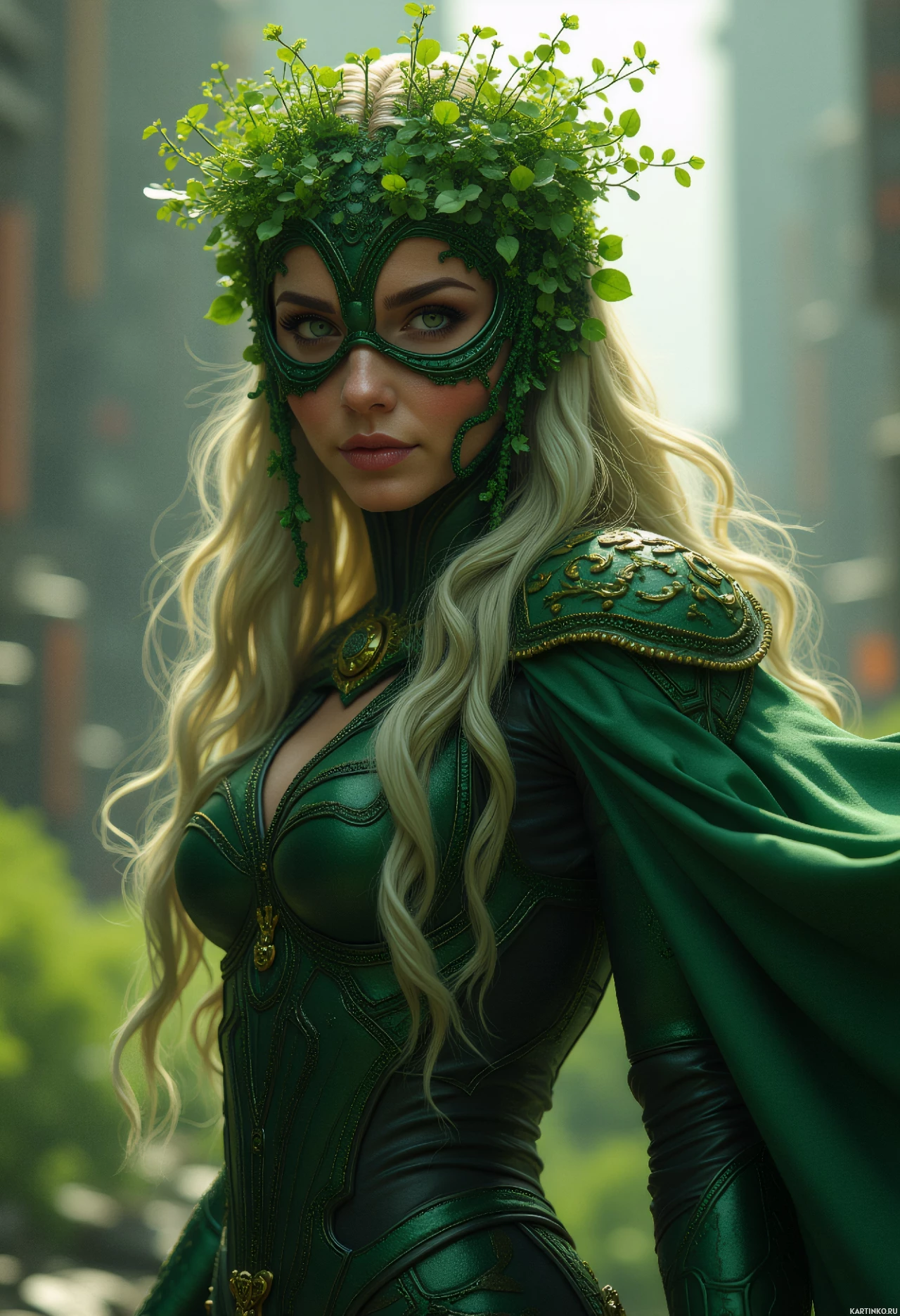 The image depicts a woman with long blonde hair wearing a mask with pointed ears, resembling a fantasy or superhero character. She is adorned with green plant-like accents on her head and shoulders, which could be interpreted as a crown of leaves or flowers. Her eyes are focused, and she has a determined expression on her face. The woman is dressed in a full-body suit that appears to be armor with a combination of dark green and gold colors, featuring intricate patterns and designs. The background suggests an urban environment, possibly hinting at a city street scene.