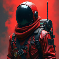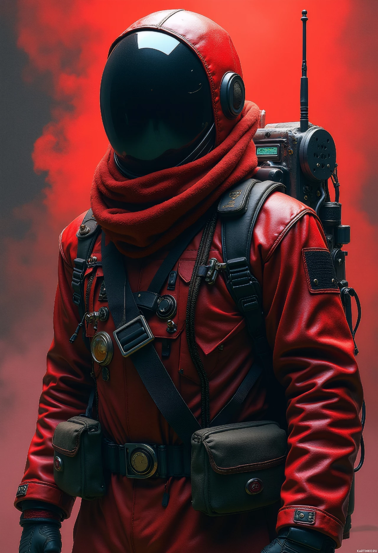 body suit that includes a helmet with a red visor and a breathing apparatus. The suit has numerous pockets and straps, suggesting it might have various utilities or equipment related to the person's role or activity. The style of the image suggests