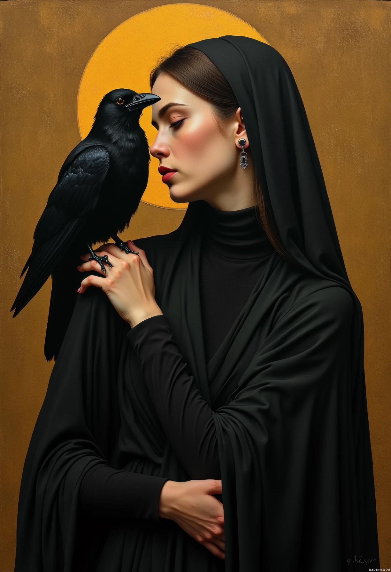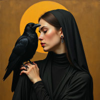 dark hair. In front of her face, there is a crow on her shoulder. She appears to be holding the bird gently, possibly petting it. There is also another crow perched on her right arm, which she holds slightly away from her body. The background suggests
