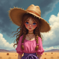 На этой картинке молодая девушка стоит в широком поле с высокой травой и яркими красными маками. На ней традиционный наряд: розовое платье с воланами на плечах и талии, а также широкополая соломенная шляпа. Она смотрит в сторону, ее взгляд серьезен. Над головой – облачное, серое небо, намекающее на пасмурный день.