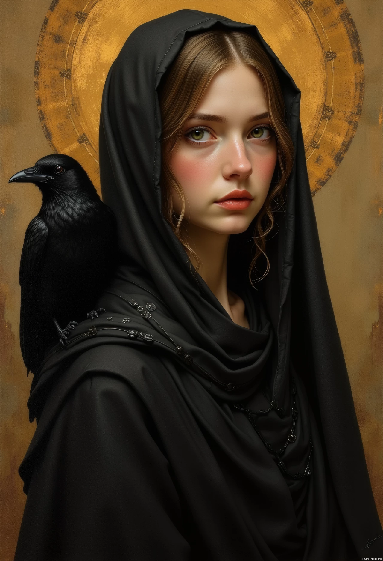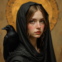 black bird is perched on her shoulder. Behind her head is an illuminated halo or aureole effect, typically associated with religious depictions of saints or holy figures. The background is simple, featuring