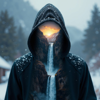 visual effect as if a portion of the person's torso is missing, revealing the waterfall scene inside. The background behind the individual is blurred and indistinct, focusing attention on the hoodie and its graphic design. The overall style of the image is artistic and creative, with a strong emphasis on the graphic print of the hoodie as the main subject.