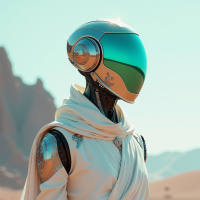 advanced technology such as a helmet or mask that includes a visor which is tinted in shades of green and black. The attire of the robot combines elements of fantasy and science fiction. The figure wears