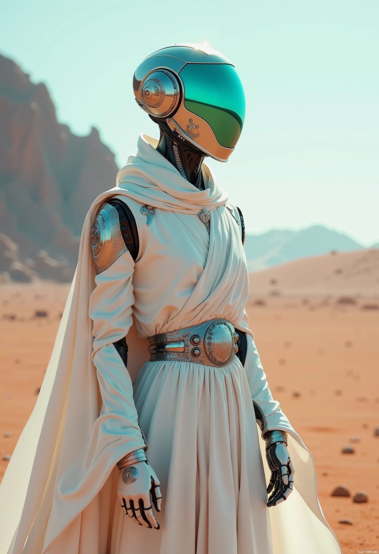 futuristic attire. This figure is standing on what looks like the surface of Mars, given the red sand and