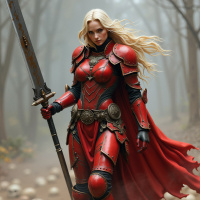 blonde hair that flows down her back, and she is holding a sword in one hand. The armor appears to be battle-worn, suggesting she may be a warrior or knight. Surrounding the character are