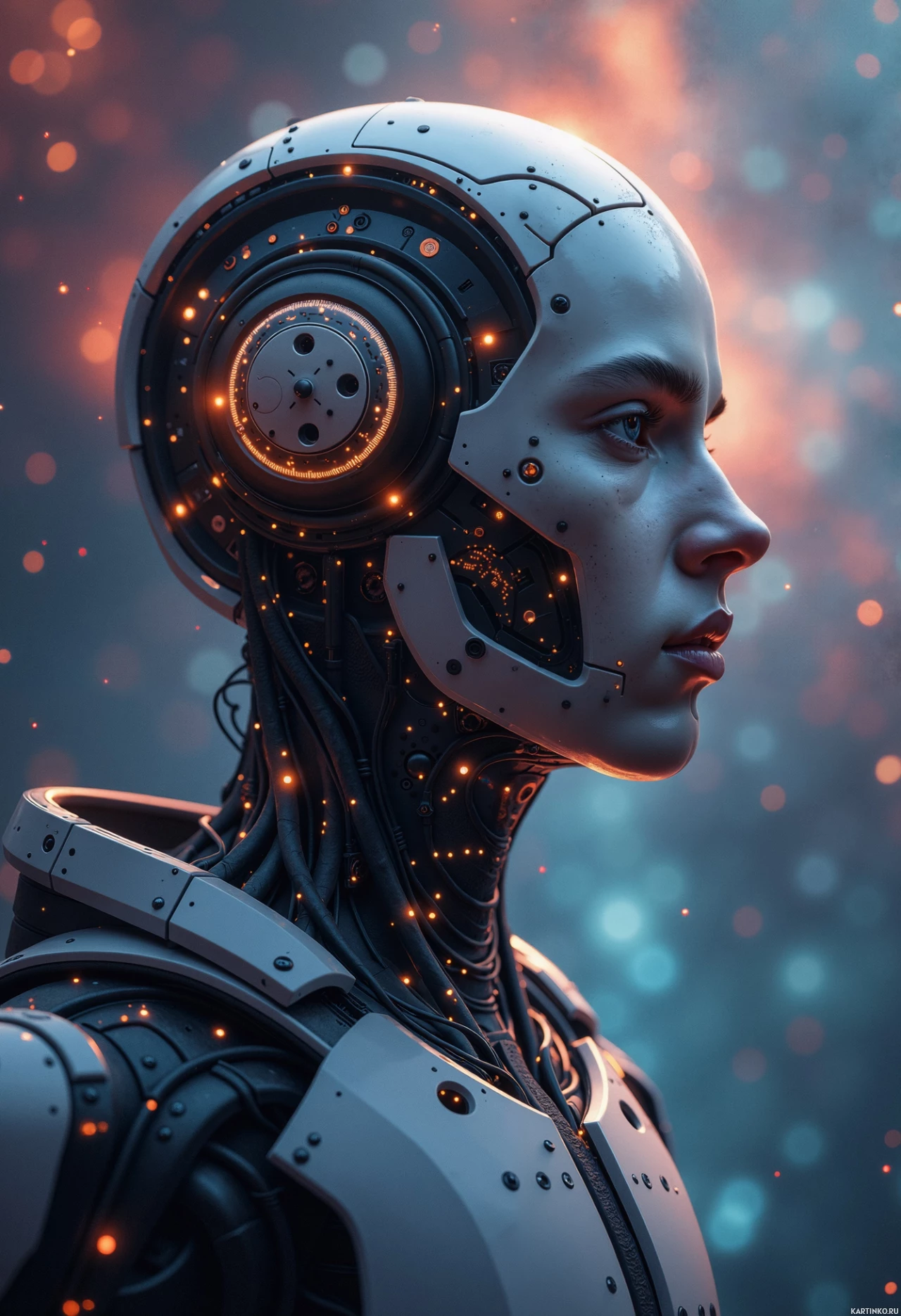 a body armor or exoskeleton. The color palette is dominated by blues and greys, giving the image a cool and technological feel. There are subtle glowing orange particles or energy emanating from the robot's head and neck, adding to
