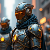eye area which suggests some form of technology integrated into the design. The character is wearing what seems to be