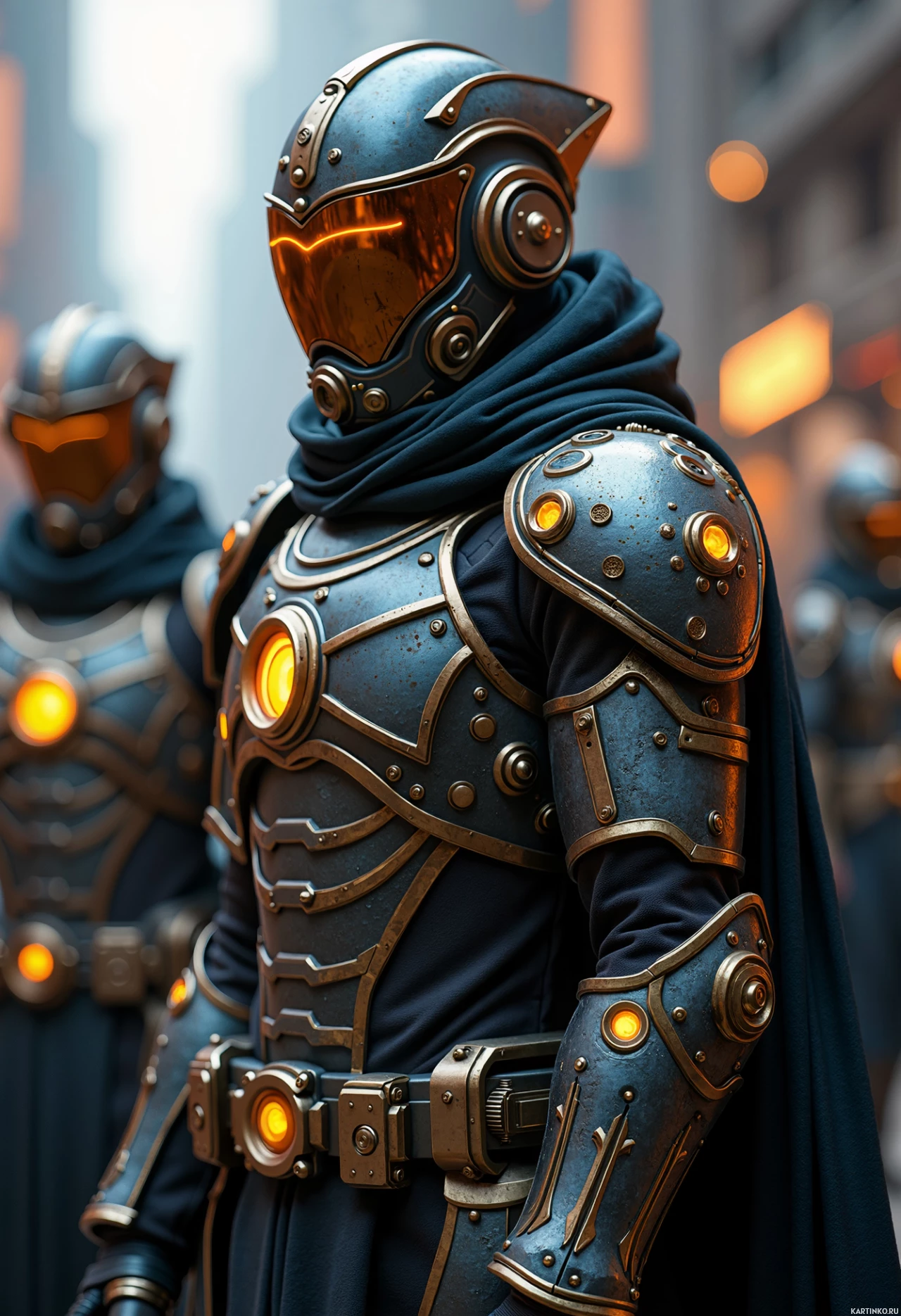 decorative patterns that give it a robotic or cybernetic appearance. There's also a visible glow from the helmet's