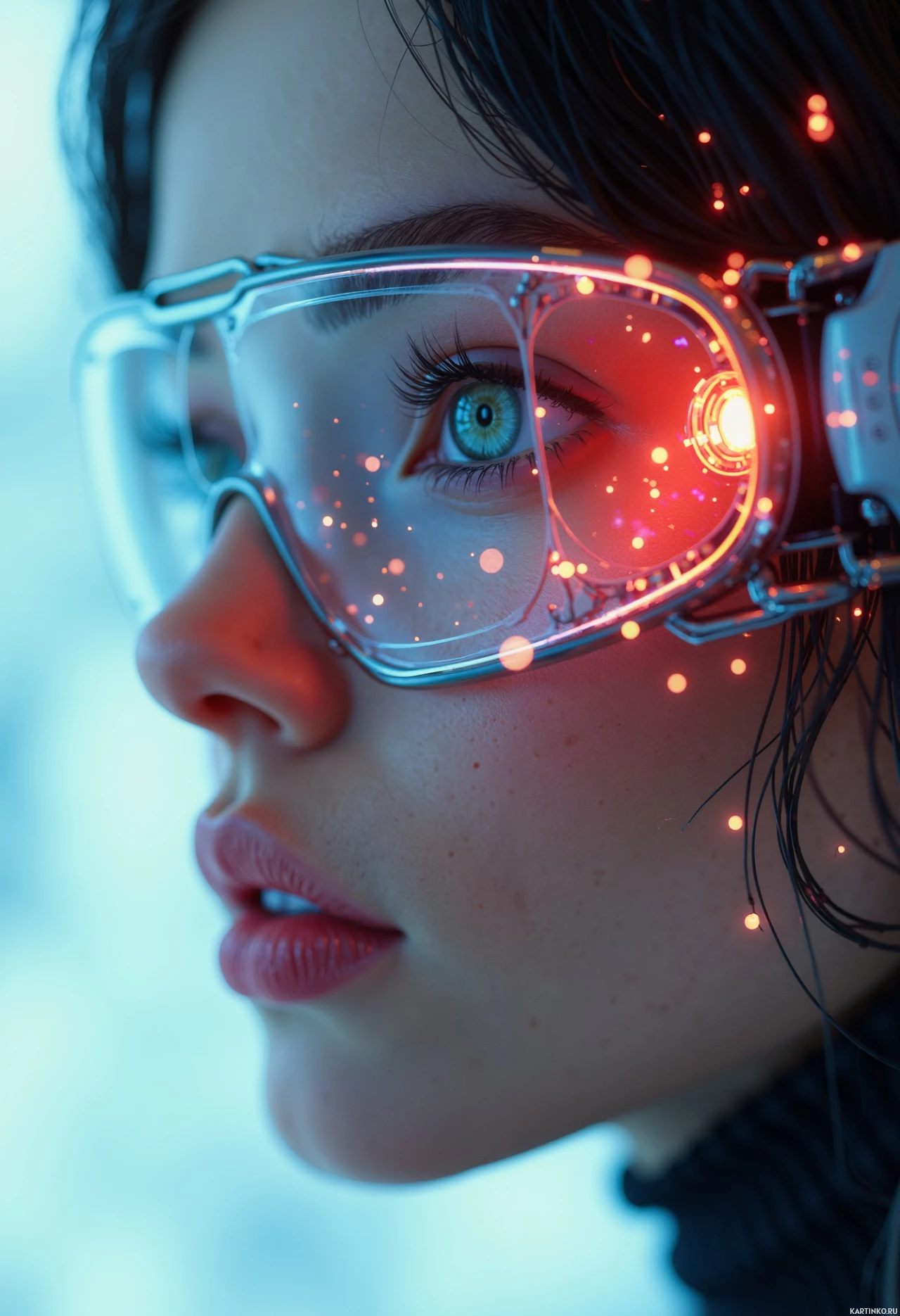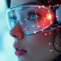 a digital overlay on one side of the face, which adds an element of technology or virtuality. The background is out of focus and gives no additional context about the setting or location. The lighting in the photo highlights the person's features, especially their eyes, which are enhanced with a light effect that resembles sparkling stars or digital particles, further emphasizing the theme of advanced technology or