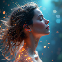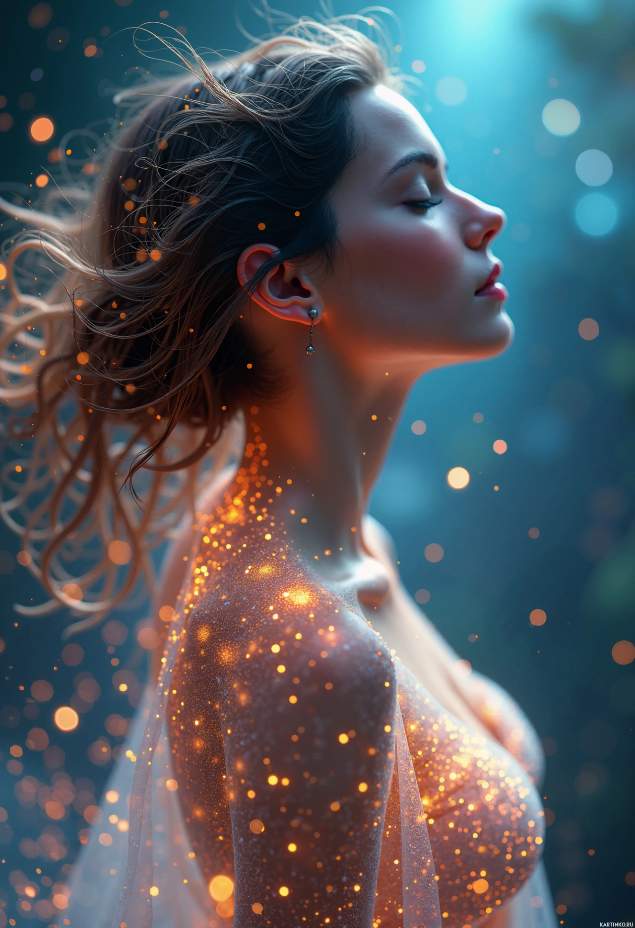 a flowing dress or robe with a sheer texture, enhancing the ethereal quality of the image. The background is blurred, emphasizing the subject and adding to
