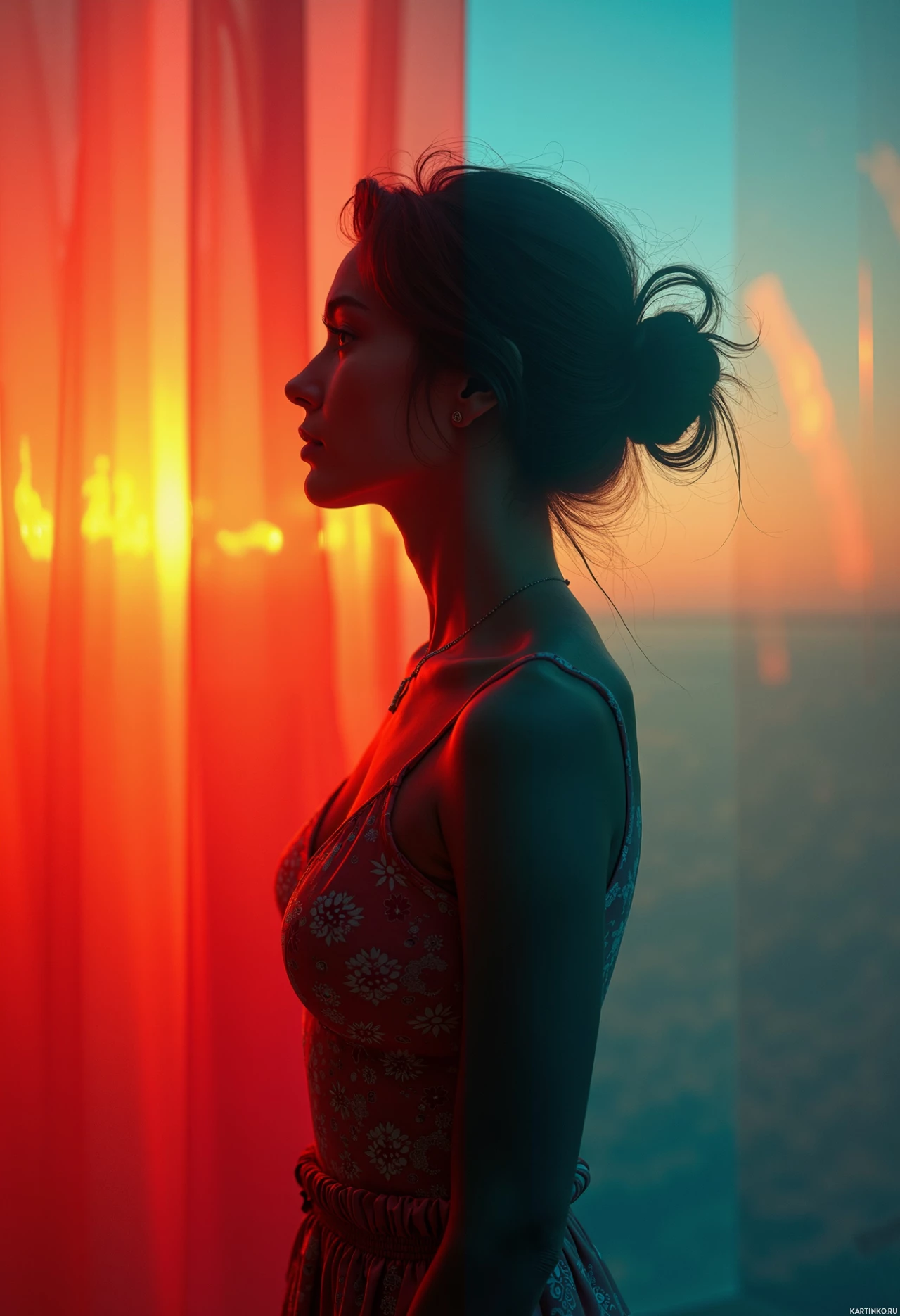 a light source that creates an illuminated effect behind her. The backdrop is colorful, featuring hues of yellow, orange, and red, which could suggest a time around sunrise or sunset. The woman is wearing
