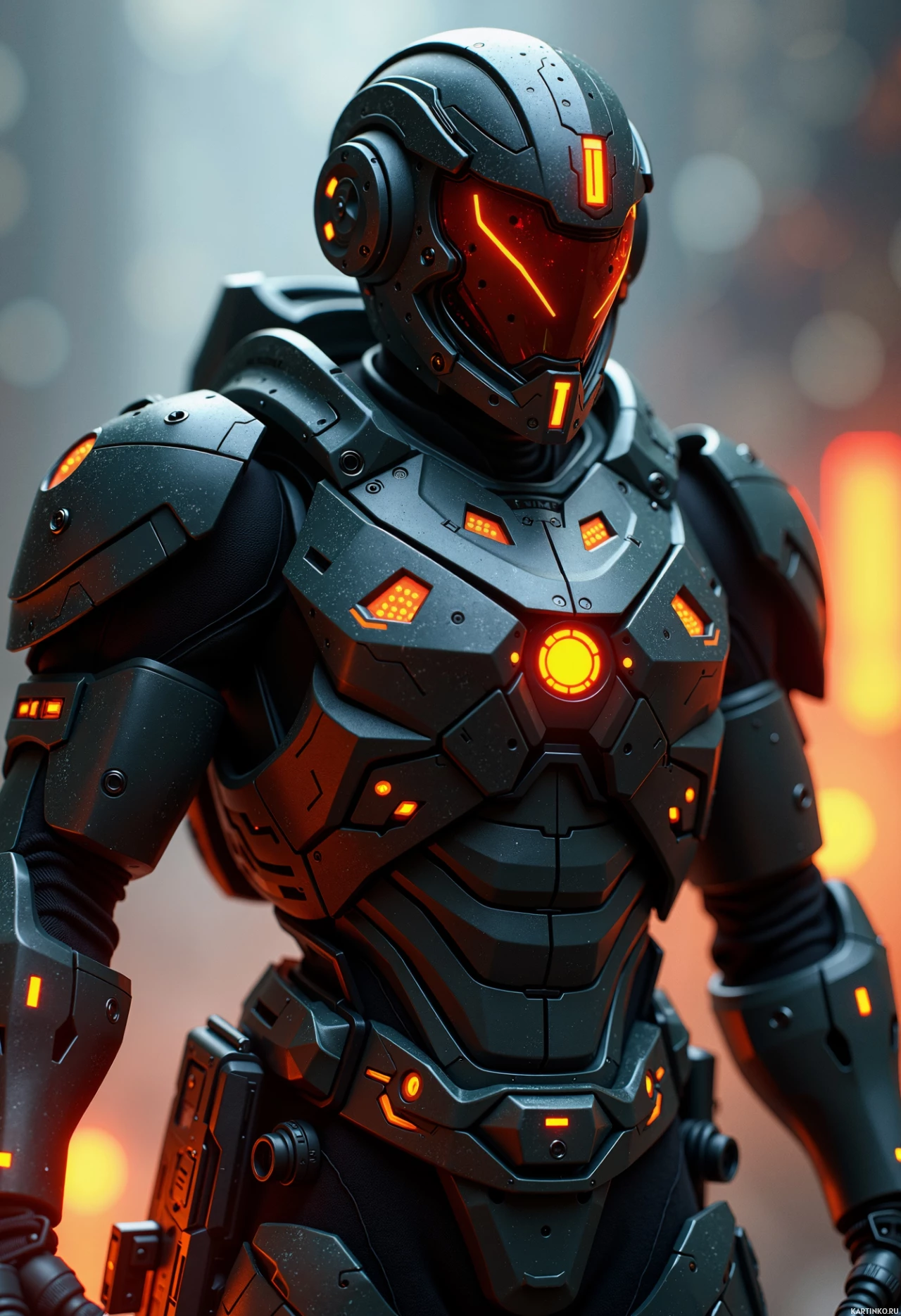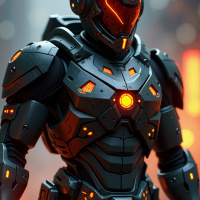 armor suit. The suit has a predominantly dark color scheme with orange and
