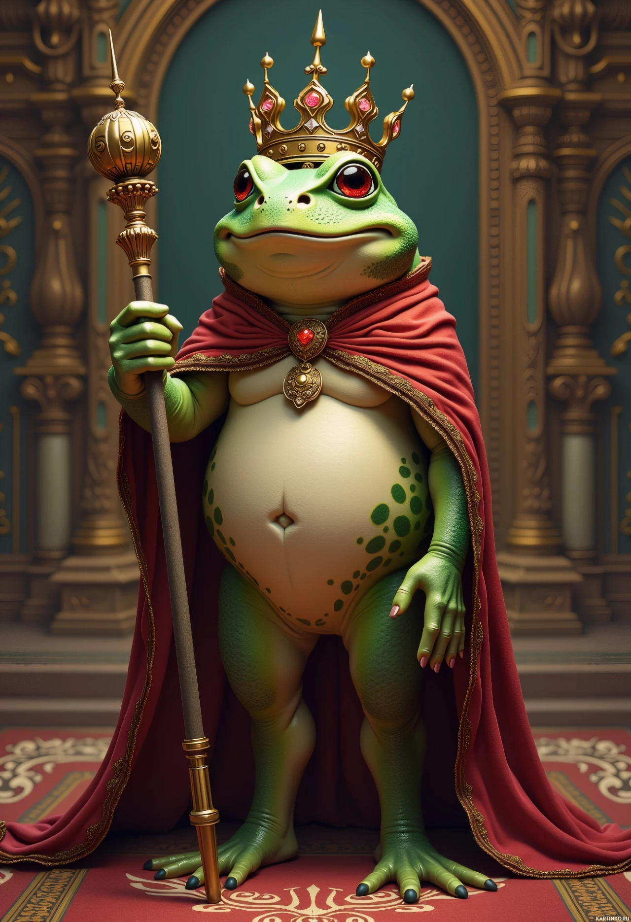 an anthropomorphic frog wearing a crown and robe, seated on what appears to be a throne. The frog is holding a scepter in its left hand, which suggests it might represent a monarch or