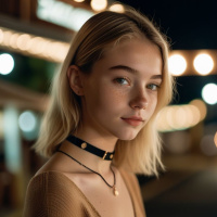 This image features a young adult female standing in an urban street setting at night. She has a very short, blonde haircut and appears to have a light skin tone. Her makeup is natural with a focus on her lips which are painted a deep red shade. She is wearing a high-necked top with a brownish color that has a scoop neckline, allowing some skin to be exposed between the garment's neck and the wearer's shoulders. Her gaze is directed straight at the camera, and her facial expression is neutral. The background shows a lit sign advertising something with the text "MOTOR" visible, suggesting she might be near a business or establishment related to vehicles or transportation. The lighting in the photo is moody, with shadows cast on the ground and her, indicating that artificial lights are present from the surrounding buildings or streetlights. There is no overt text within this image to provide additional context or information.