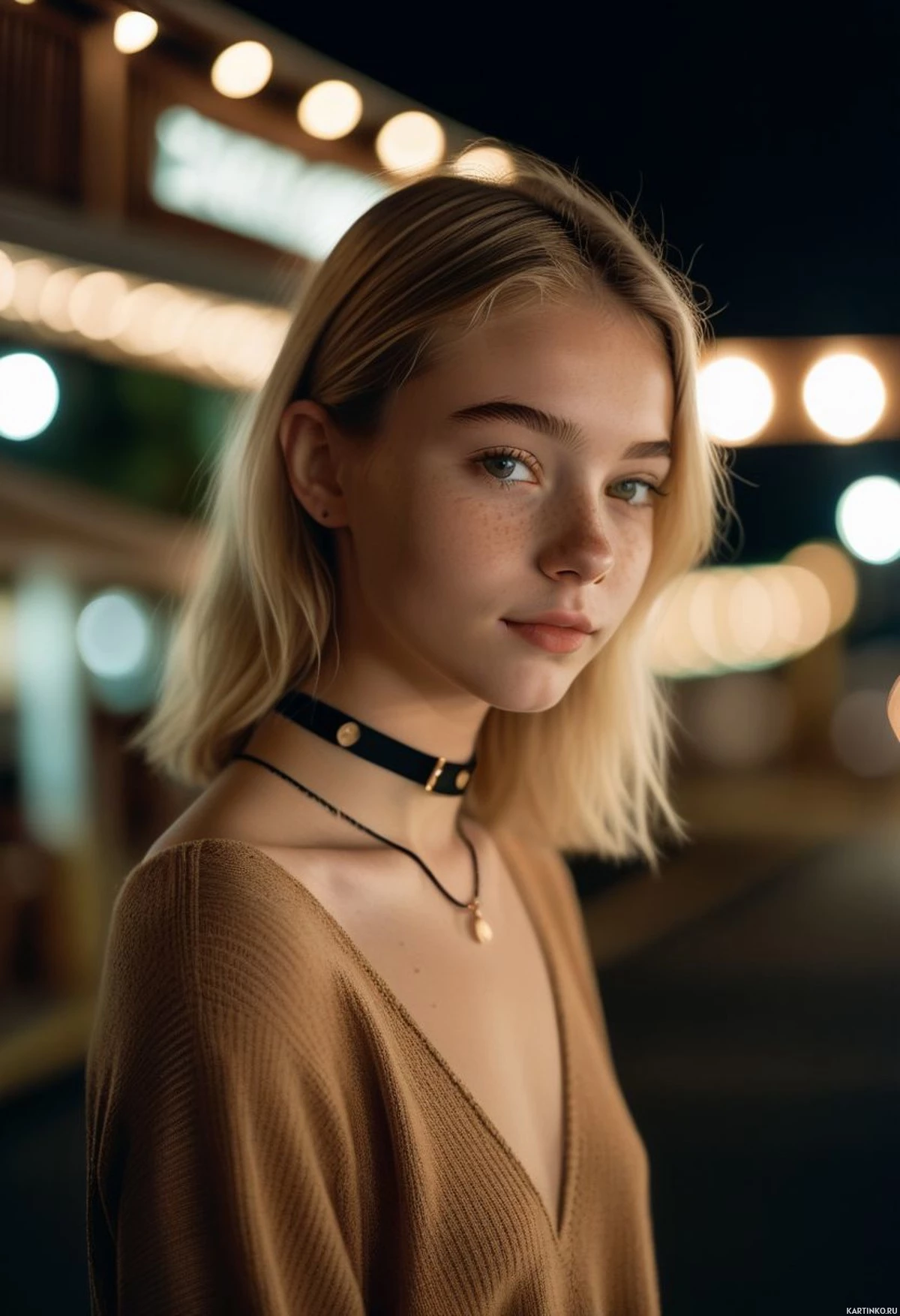 На картинке изображена молодая женщина, стоящая на ночной городской улице. У неё очень короткая, светлая стрижка и светлый тон кожи. Макияж натуральный, акцент сделан на губах, которые подкрашены насыщенным красным цветом. На ней топ с высоким вырезом коричневого оттенка, с вырезом "лодочкой", открывающим кожу между воротником и плечами. Взгляд направлен прямо в камеру, выражение лица нейтральное. На заднем плане видна подсвеченная вывеска с текстом "MOTOR", что наводит на мысль о том, что она находится рядом с предприятием или заведением, связанным с транспортом или автомобилями. Освещение на фотографии мрачное, на землю и на неё падают тени, что говорит о наличии искусственного освещения от окружающих зданий или фонарей. В картинке нет явного текста, дающего дополнительный контекст или информацию.