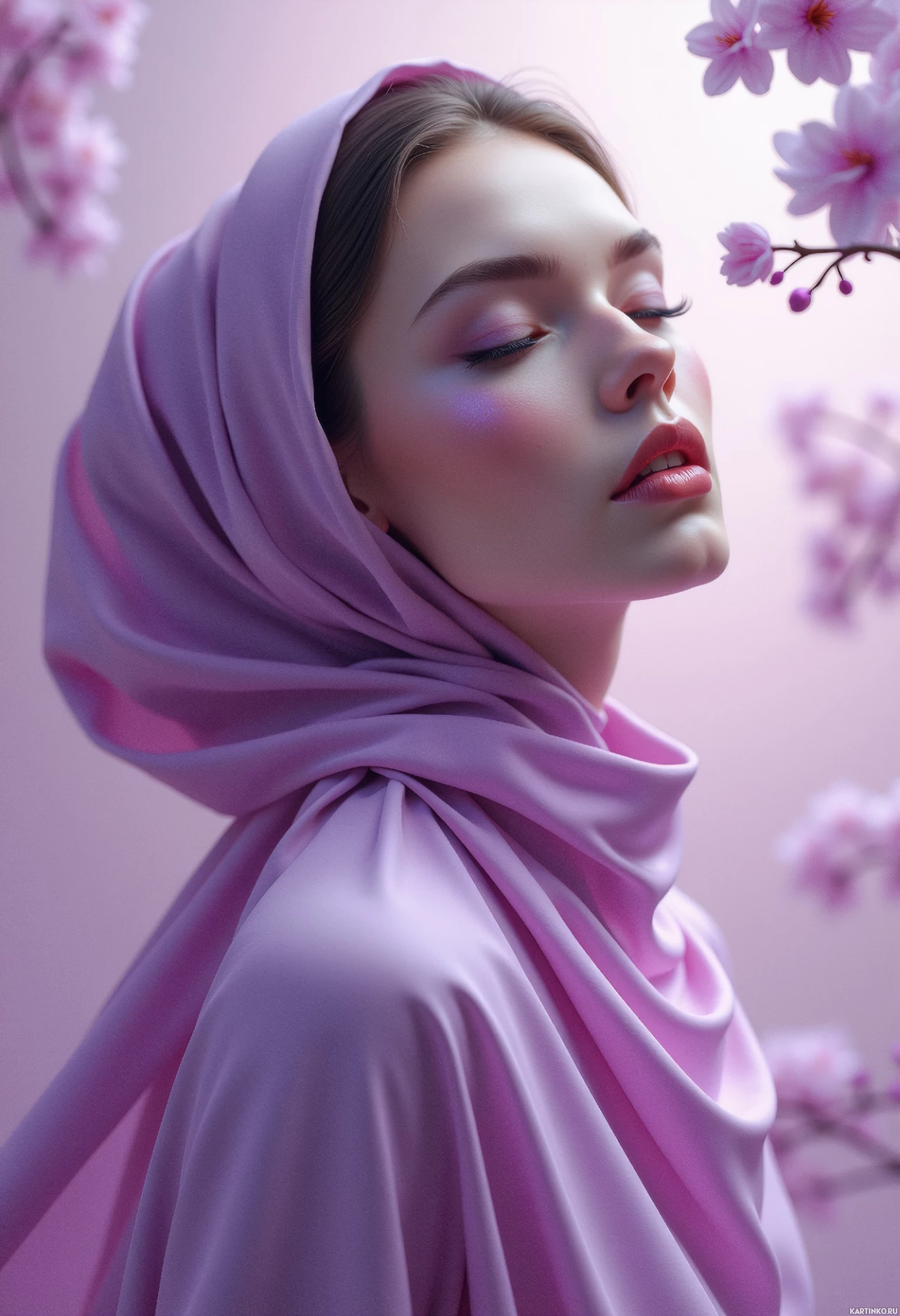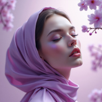 a moment of peace or introspection. She has a pink veil that covers her hair and is tied around her head, suggesting a cultural or religious aspect to her attire. Her lips are lightly colored, likely a shade of red or pink lipstick, which adds to the soft and delicate quality of the image. Surrounding her head is a halo of pink blossoms, possibly