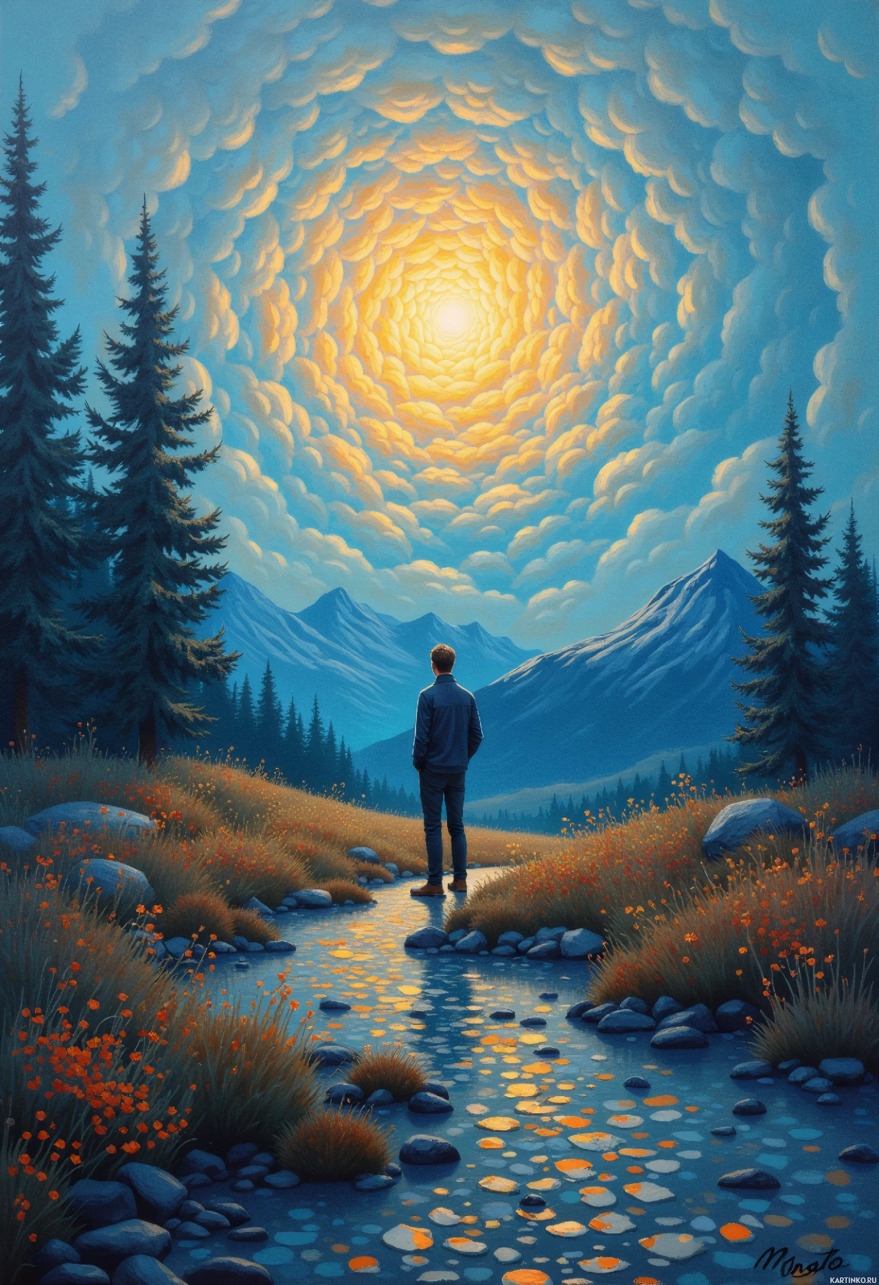 Картинка изображает пейзаж с огромной круглой радугой, окружающей центральное, светящееся солнце, которое создает арку над всей сценой. На переднем плане журчащий ручей, по берегам которого видны камни и трава. Слева, на фоне неба, силуэты двух вечнозеленых деревьев, похожих на сосны. В средней части картинки стоит человек, стоя спиной к зрителю. Вся сцена очень спокойная и немного сюрреалистична благодаря радуге и форме солнца.