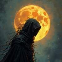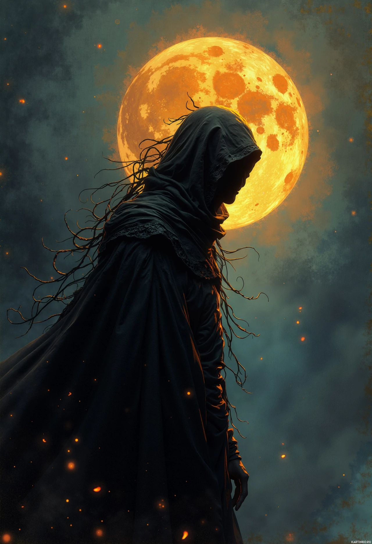 a dark cloak and hood, which obscures their face and form. They are looking out into the distance, possibly observing something out of frame or lost in thought. The setting is nighttime with an orange moon visible in the sky, suggesting either late evening or