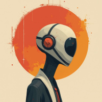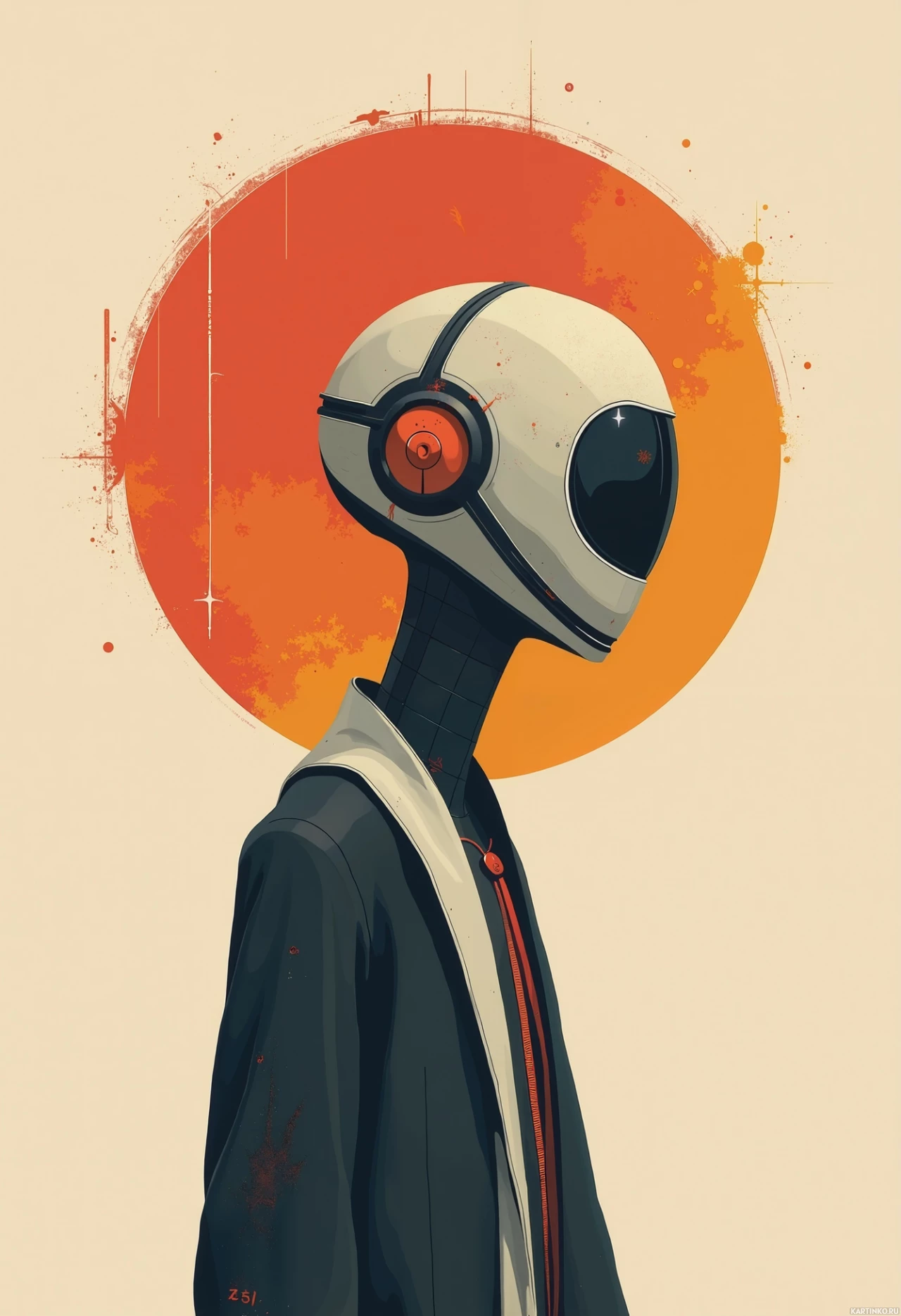 light highlights. The robot's design suggests a futuristic or science fiction theme, often associated with robots in such settings. In the background, there is a gradient that transitions from yellow at the top to orange near the bottom, which could represent sunrise or another form of