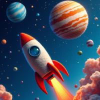 white markings and lettering, blasting off from the bottom center against a backdrop of numerous colorful planets and stars. The rocket has a blue exhaust trail that contrasts with its vibrant