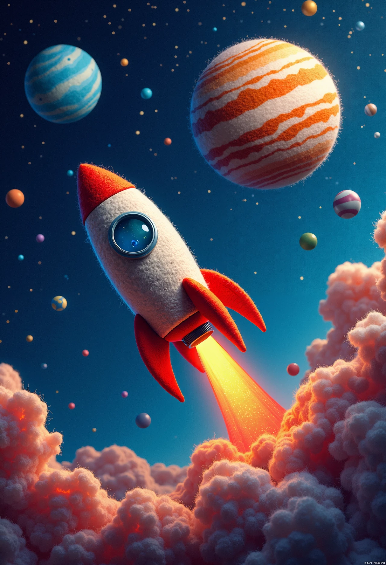 white clouds that resemble soft cotton candy. The background is dominated by a deep black space filled with stars twinkling in shades of white and blue. On the right side, there's a small comet-like object trailing behind the rocket, adding to the sense of motion and exploration. The image conveys a sense of adventure and exploration, possibly suggesting themes of space travel and discovery. It is visually rich and appealing, with vivid colors that create an imaginative and lively atmosphere.