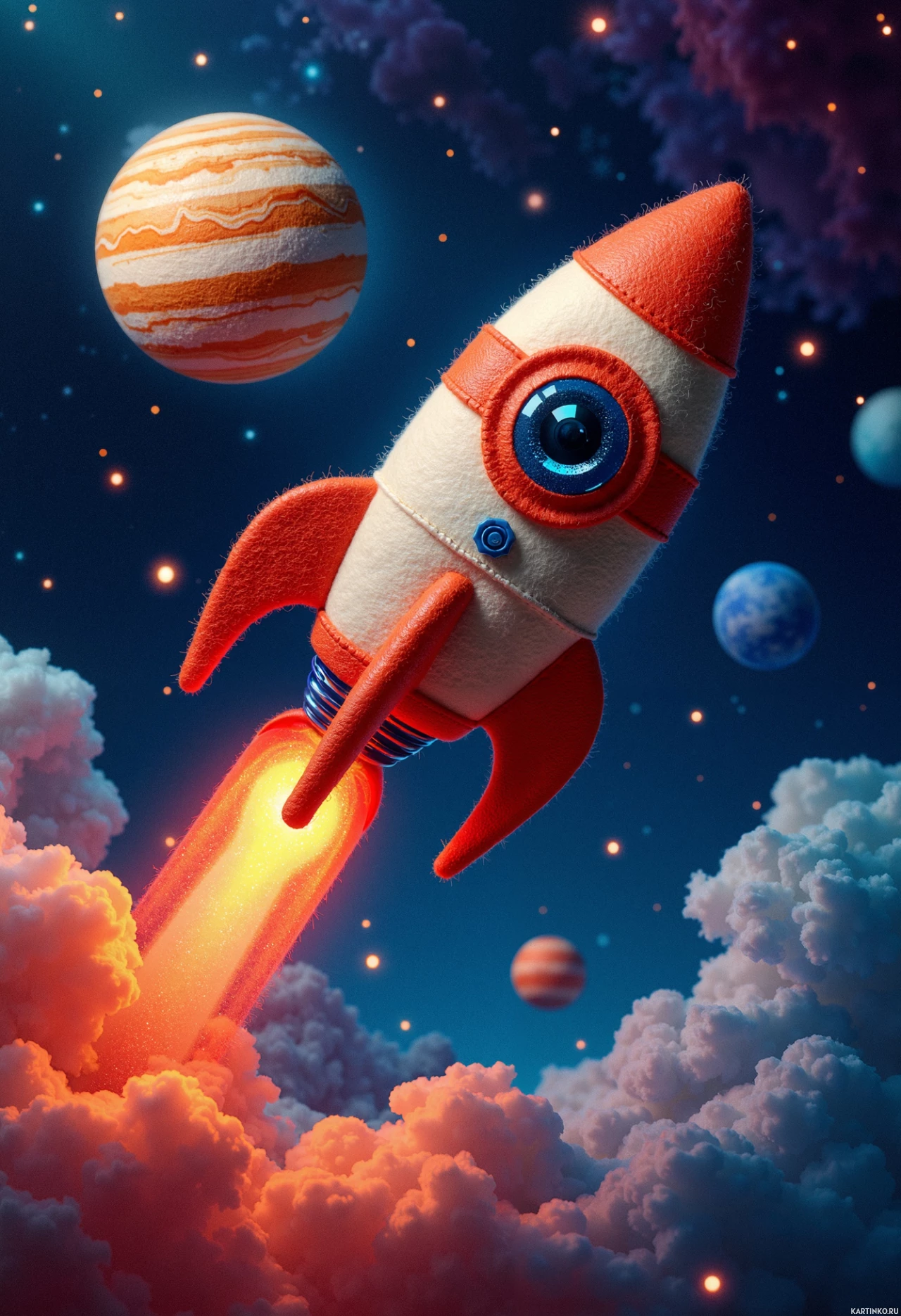 На картинке ракета взлетает в космос на фоне планет, развернувшихся в звёздном ночном небе. Рядом с ракетой вихри красных и синих облаков, словно подчёркивающие движение и активность. Ракета стилизована под персонажа из мультфильма, с плавниками по бокам для устойчивости. На заднем плане видны Венера и Юпитер, узнаваемые по своим характерным чертам и расположению в Солнечной системе.