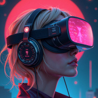 red jacket or top, and she is also wearing large over-ear headphones with visible branding on the side. The background suggests a futuristic setting with neon lights and