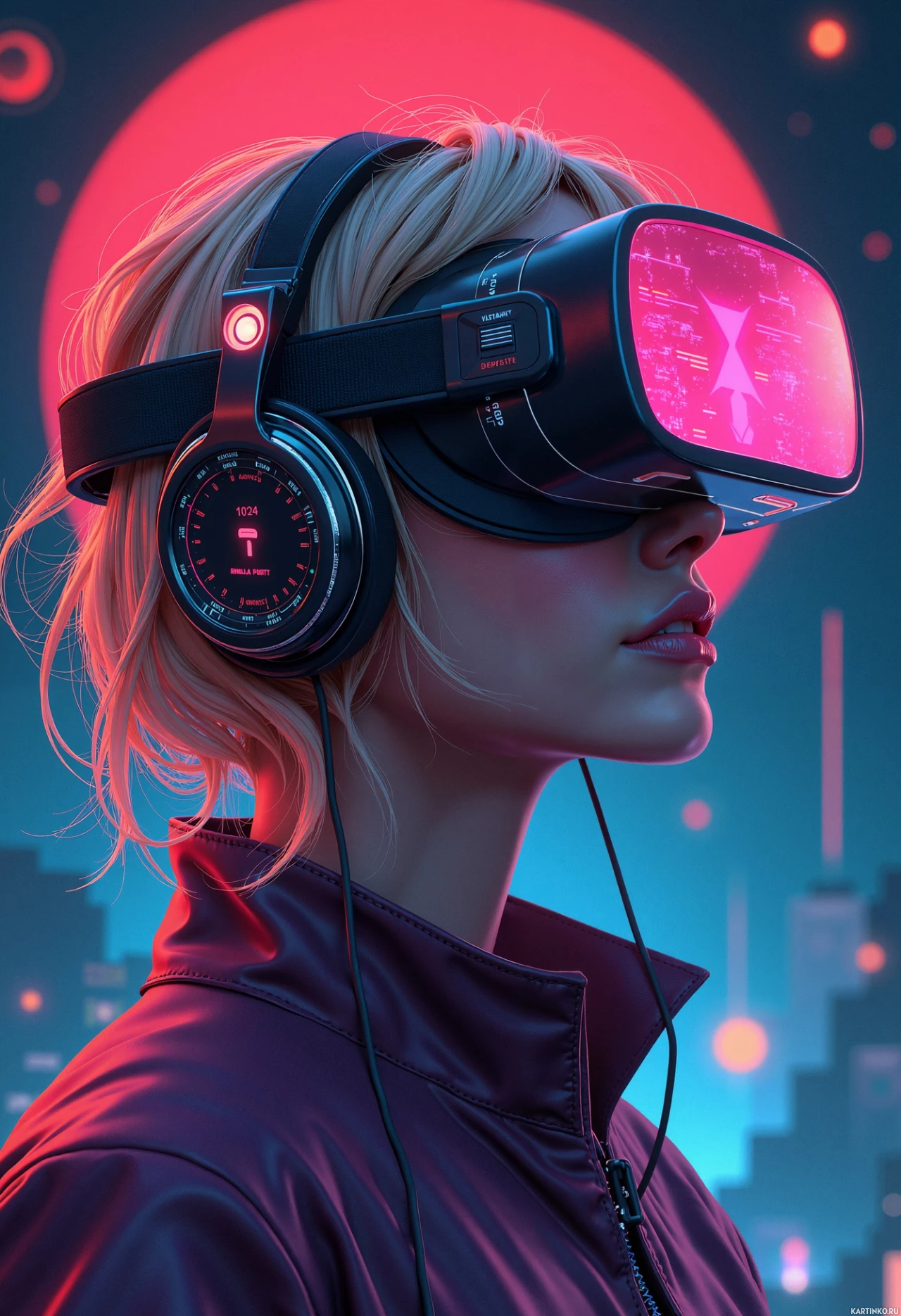 The image features a woman wearing virtual reality (VR) headgear with pink and black designs. She has