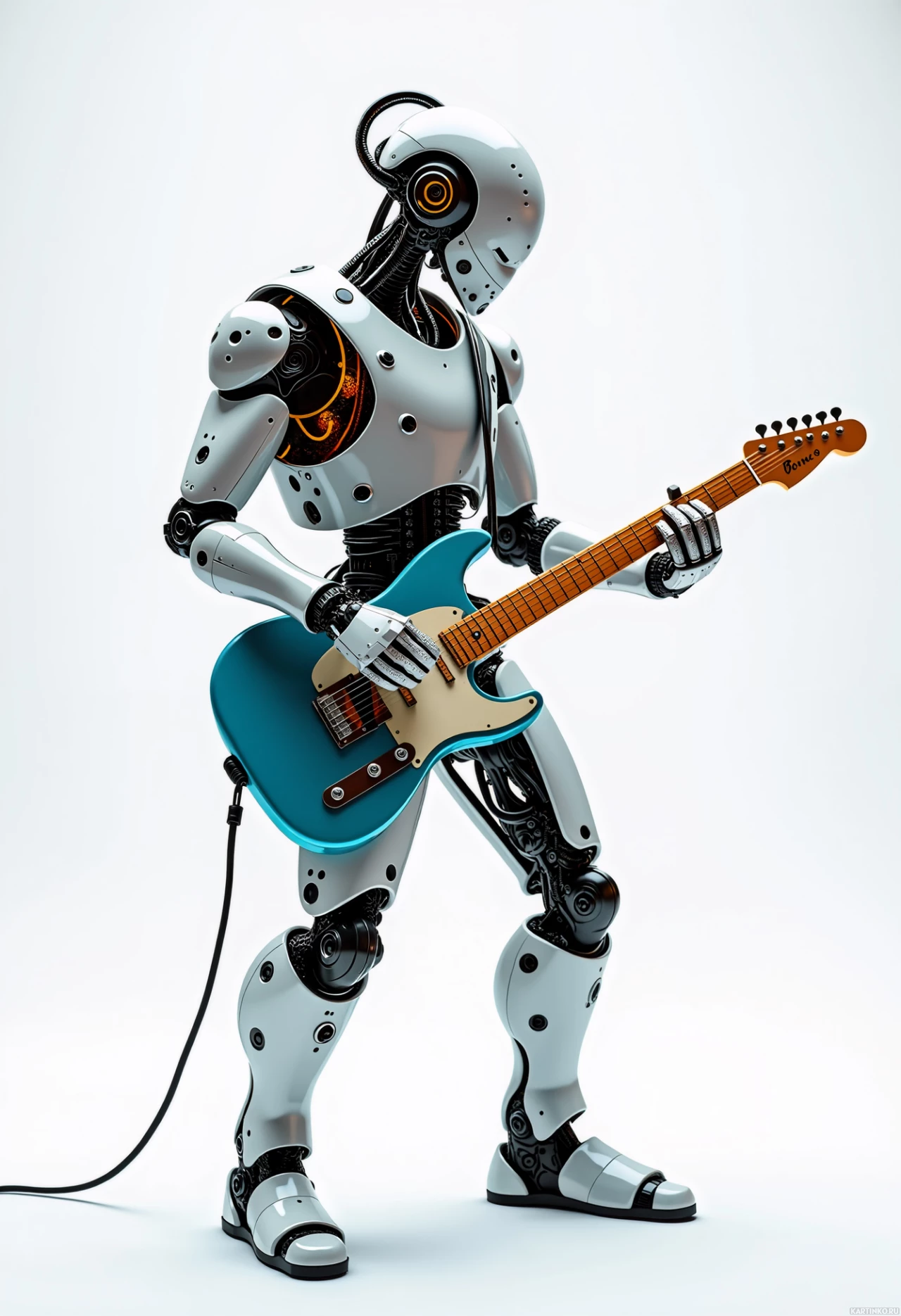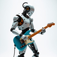 a neutral backdrop that allows the robot and the guitar to stand out prominently. This scene is likely part of