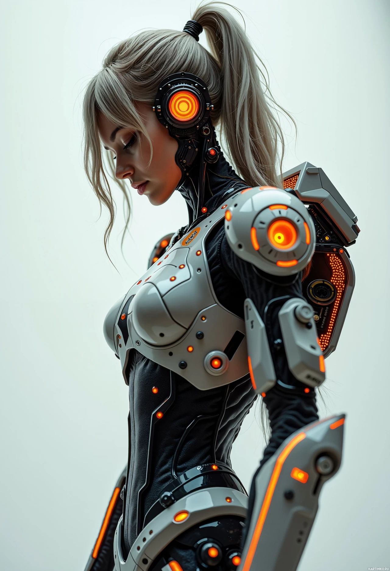 a high bun. The armor appears to be made from a combination of metallic and transparent materials, with glowing