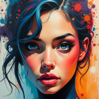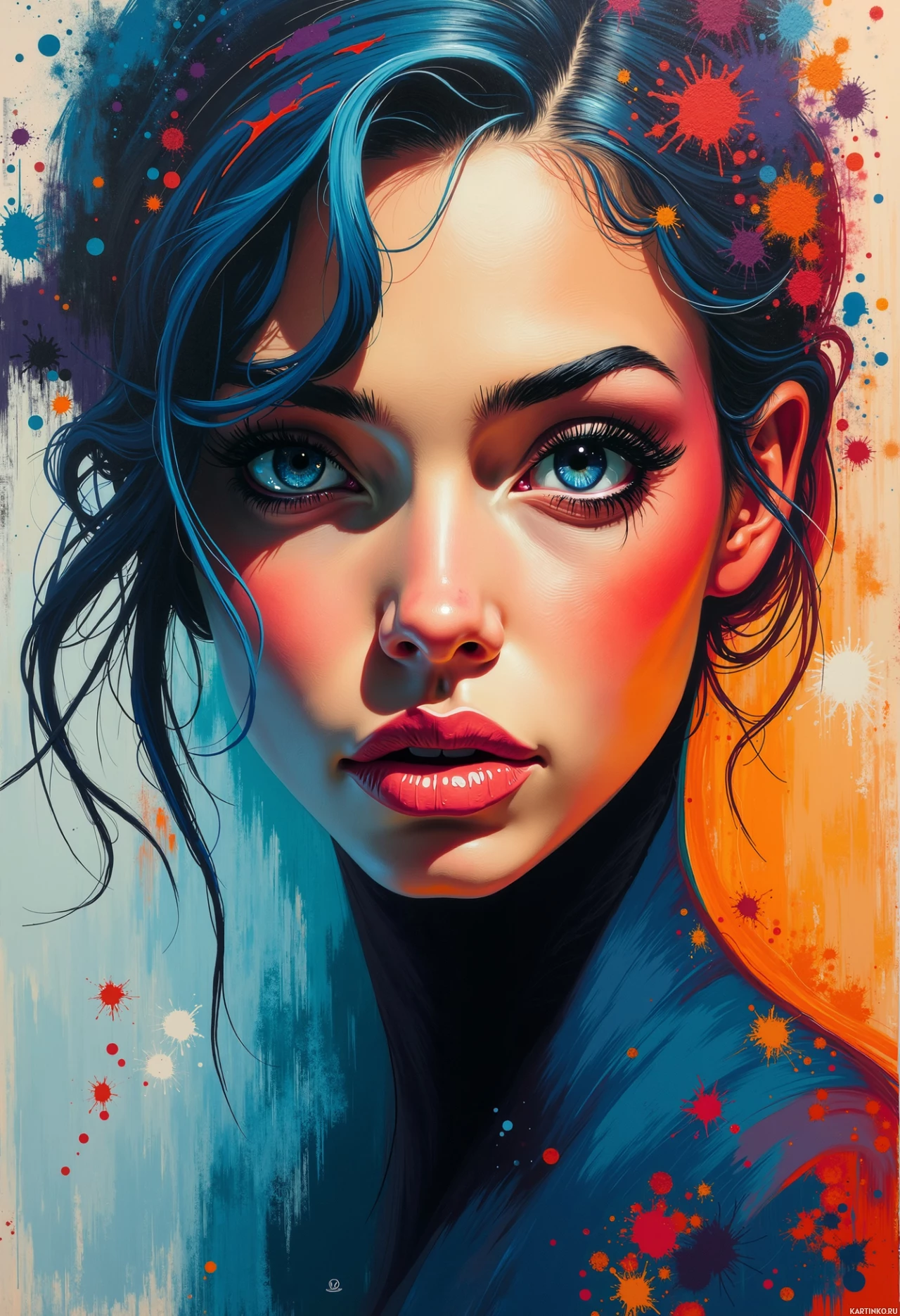 a young woman with blue hair, set against a vibrant background that resembles splattered paint. Her eyes are looking off to the side and she has