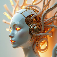 robotic character. It features a human-like face with detailed facial features such as eyebrows, eyes, lips, and a nose. The head is adorned with