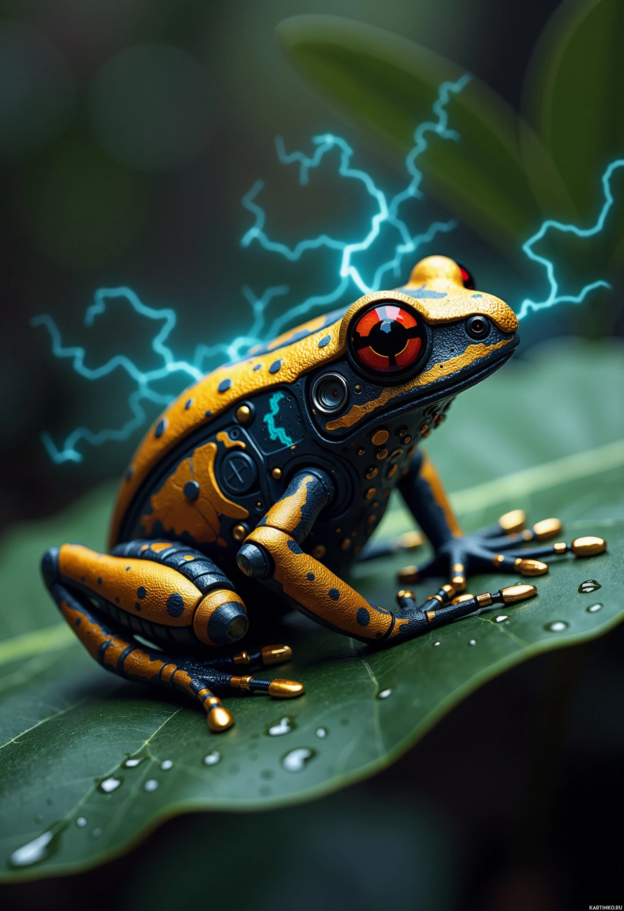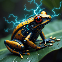 The image features a stylized depiction of an animal, specifically a frog, that has been digitally altered to give it an appearance reminiscent of a robot. It is sitting on what appears to be a leaf, and there are visual effects added, such as electric sparks or