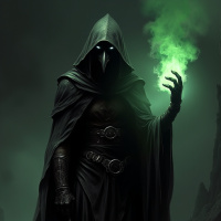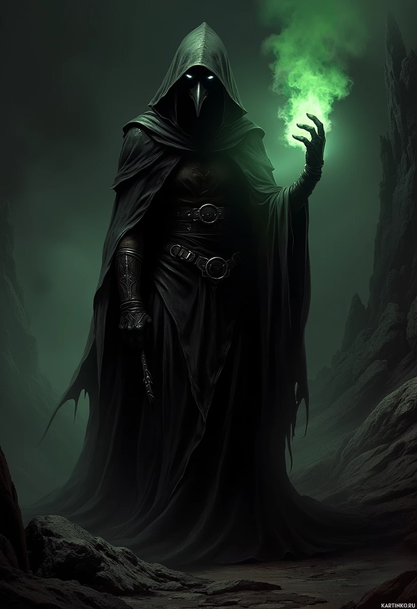 На картинке изображён персонаж в тёмном плаще и капюшоне, с маской, скрывающей лицо. Он стоит на зловещем фоне из скал и светящегося зелёным светом элемента. Общая атмосфера картинки передаёт сцену из фэнтезийного или хоррор-рассказа.