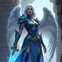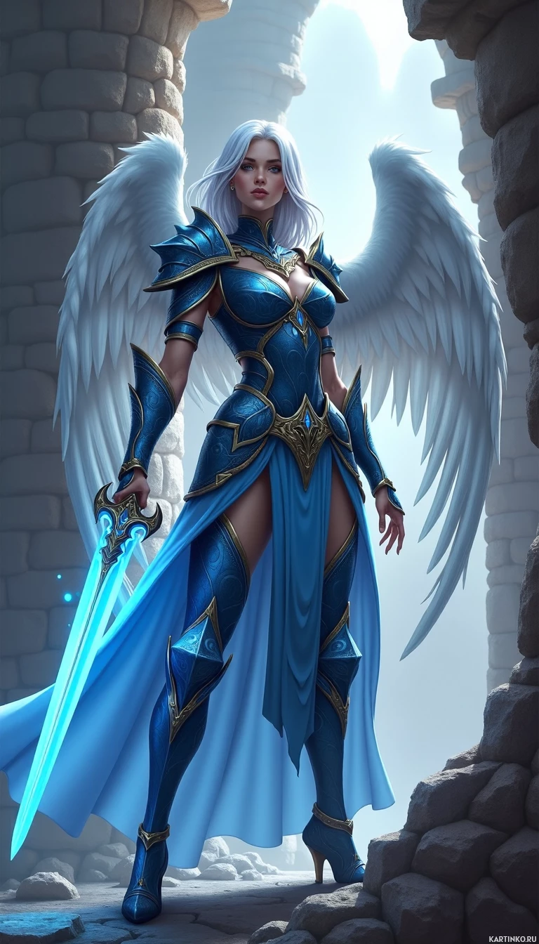 white hair and blue wings, embodying the qualities often associated with angels in fantasy mythology. She is wearing a detailed armor and holding a sword, which suggests she might be a guardian or warrior-like role within her narrative context. The background features what appears to be a stone structure reminiscent of a dungeon or castle entrance, adding to