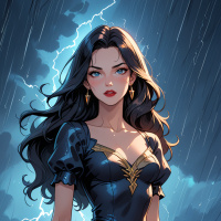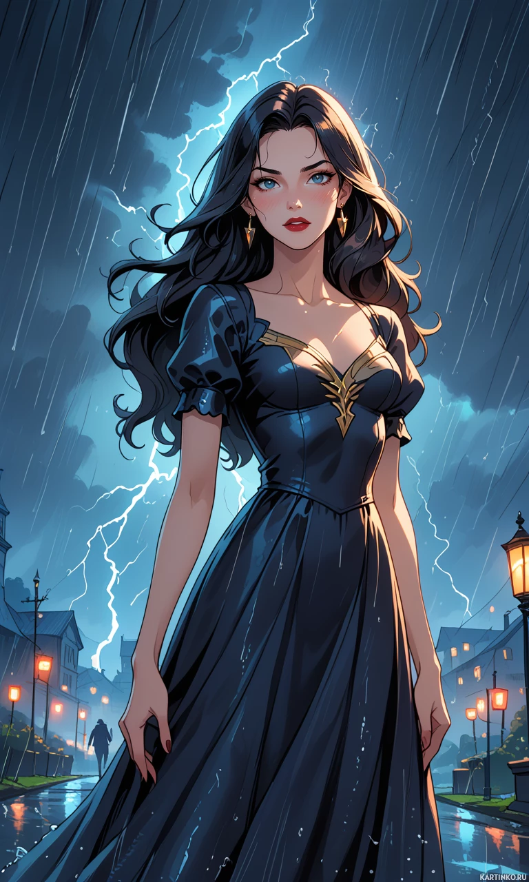 На картинке изображена брюнетка, стоящая под дождем. На ней длинное платье темного цвета с высоким воротником и короткими рукавами. Ее волосы распущены и ниспадают на плечи. На заднем плане видны силуэты деревьев и, кажется, фонарь, освещающий сцену. Молния добавляет атмосферности пейзажу.