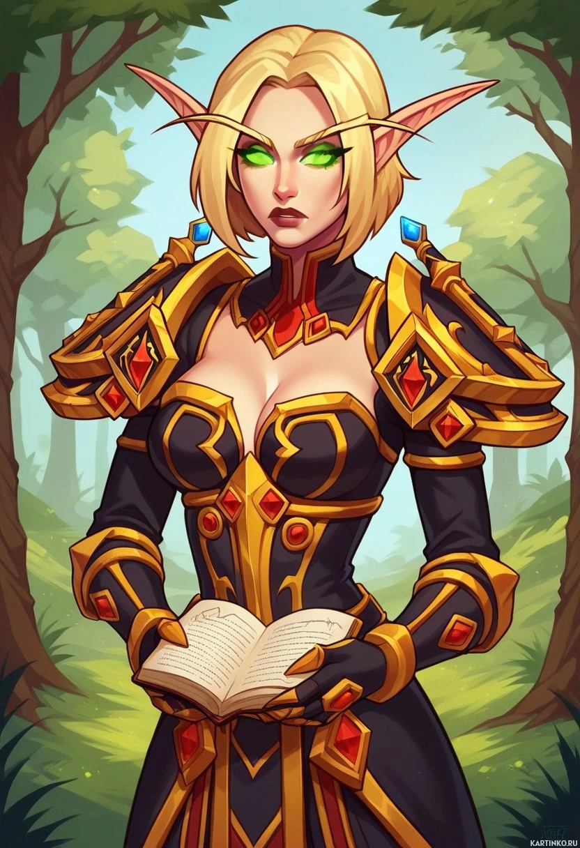 the fantasy genre, and is wearing armor that suggests she might be involved in combat or adventure scenarios. In her left hand, she holds a book, which could imply she's a scholar or a character with some knowledge-seeking role within her narrative. The background consists of a green landscape with trees, indicating