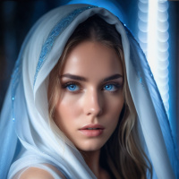 digital alteration or artistic choice. Her expression is serene, with